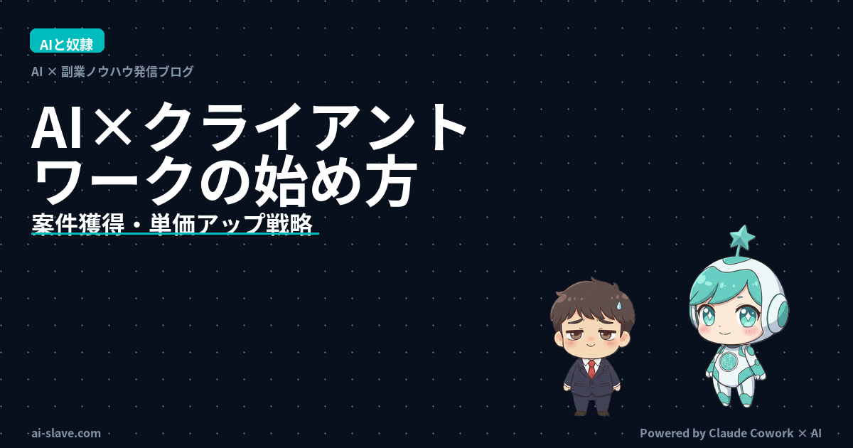 この記事では、AIを活用したクライアントワークの種類・始め方・案件獲得のコツ・単価アップ戦略まで完全解説します。AI副業全般については「AI副業の完全ガイド2026」、副業初心者の方は「AI副業初心者が最初にやるべきこと」もあわせてご覧ください。