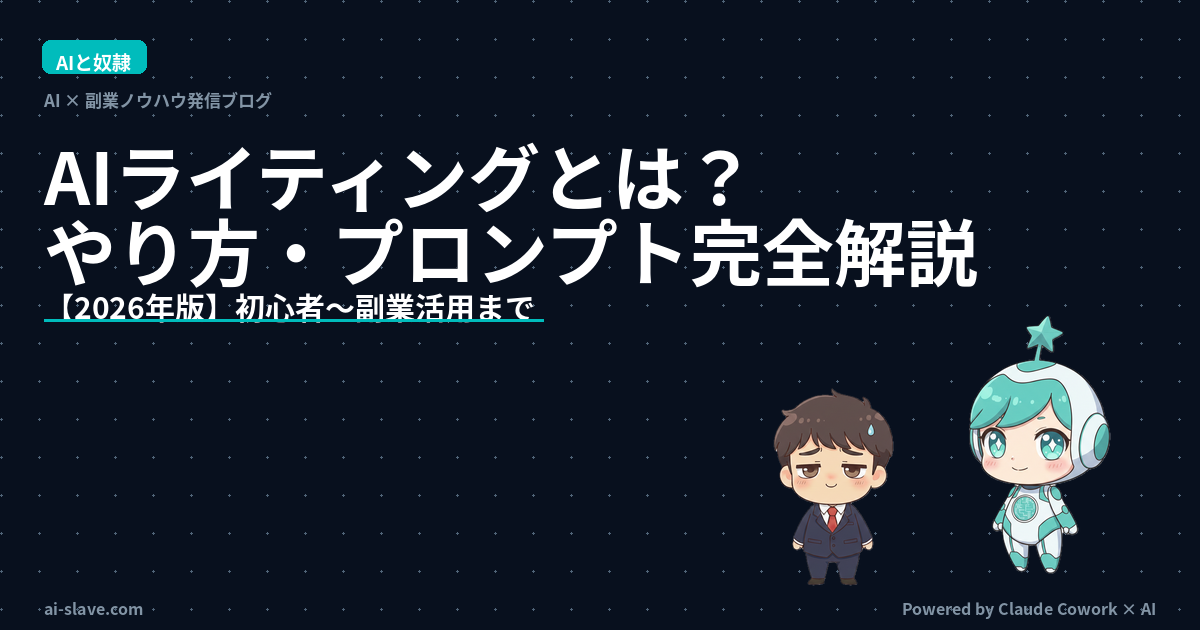 この記事では、AIライティングの基礎知識から具体的なやり方・プロンプトテンプレートまで、初心者でもすぐ実践できるように丸ごと解説します。副業としての活かし方も含めて網羅したピラー記事です。AI副業を初めて始める方はこちらの入門ガイドも合わせてご覧ください。また、AIライティングを副業として稼ぐ具体的な方法はこちらで詳しく解説しています。