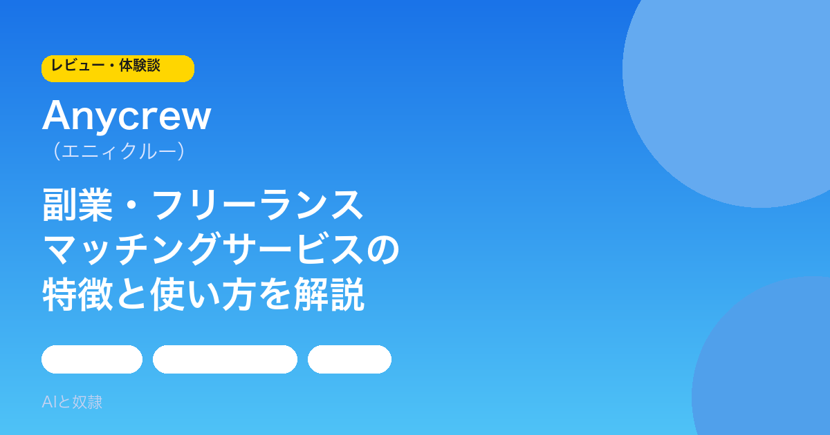 この記事では、副業・フリーランス向けマッチングサービス「Anycrew(エニィクルー)」を実際に使ってみた体験をもとに、特徴・案件の種類・登録手順・向いている人まで徹底レビューします。AI副業の全体像を知りたい方は「AI副業の完全ガイド2026」もあわせてご覧ください。