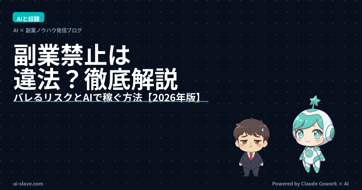 この記事では、副業禁止規定の法的な位置づけ、違反した場合の懲戒リスクの実態、そして副業禁止の会社でもAIを活用してリスクを最小化しながら収入を増やす方法まで徹底解説します。副業禁止の壁をどう乗り越えるか、2026年の最新情報とともにお伝えします。